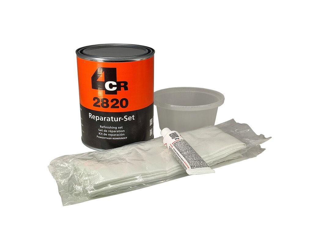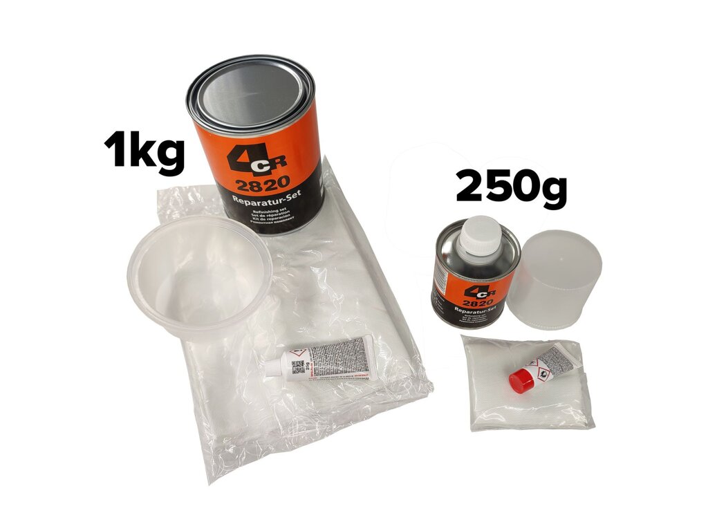 Velká laminovací souprava 2820 od značky 4CR obsahuje 1000 gramů polyesterové laminovací pryskyřice, skelnou tkaninu a benzoyl-peroxidové tužidlo. S touto kompletní laminovací sadou bez problémů opravíte větší díry či otvory na plechových a plastových dílech karosérie.