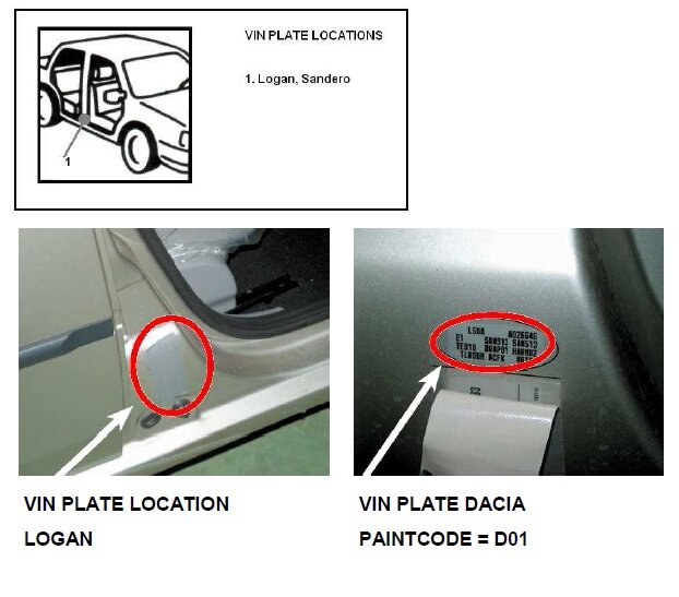 U Dacie najdete kód barvy na sloupku dveří řidiče nebo spolujezdce, může být také umístěn pod volantem na krytu pojistkové skříně nebo v motorovém prostoru, to nejčastěji u užitkových vozidel.