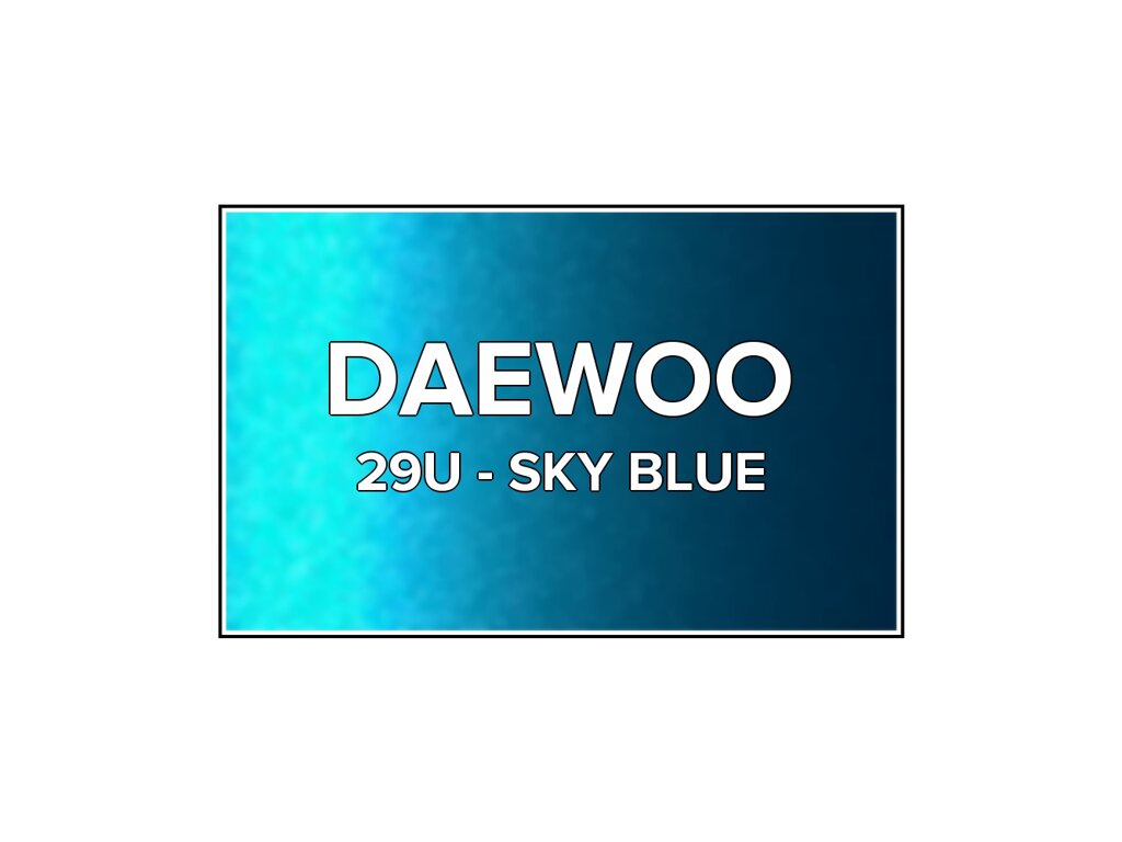 Přečíst článekModrá metalíza Daewoo 29U Sky Blue do pistole v balení o objemu 100ml. Barva SKY BLUE přesně odpovídá autolaku 29U, používaného na vozech Daewoo v letech 1998-2002. Barva na všechny povrchy, snadná aplikace, 100% krytí.