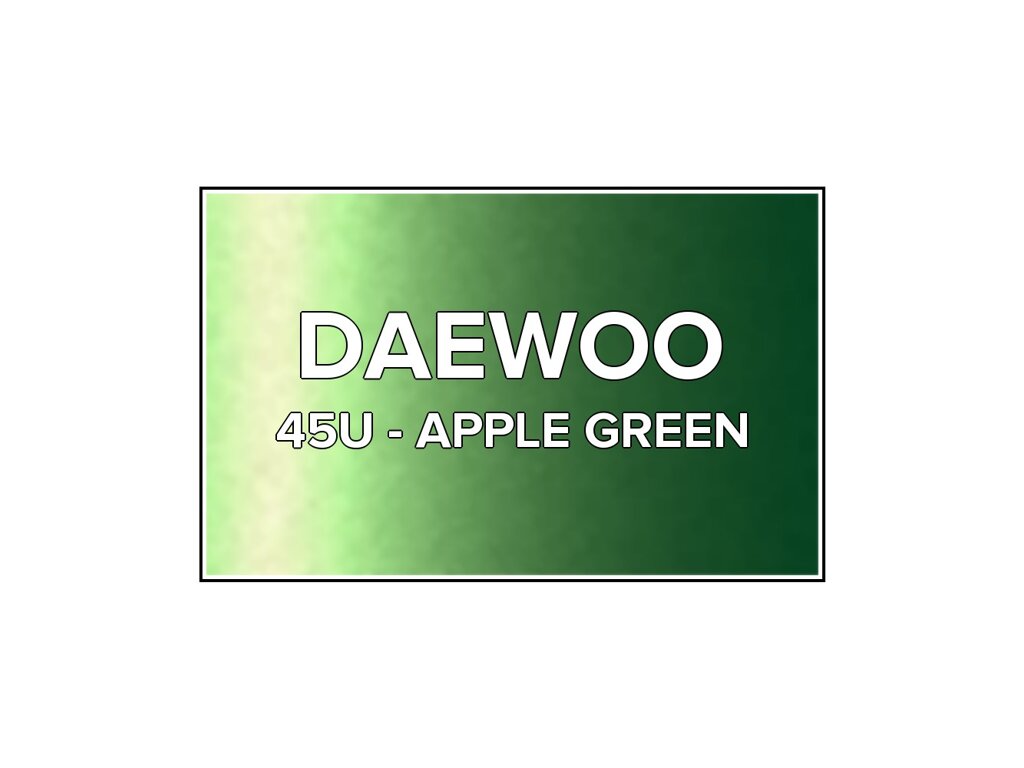 Přečíst článekZelená metalíza Daewoo 45U Apple Green do pistole v balení o objemu 100ml. Barva APPLE GREEN přesně odpovídá autolaku 45U, používaného na vozech Daewoo v letech 2005-2007. Barva na všechny povrchy, snadná aplikace, 100% krytí.