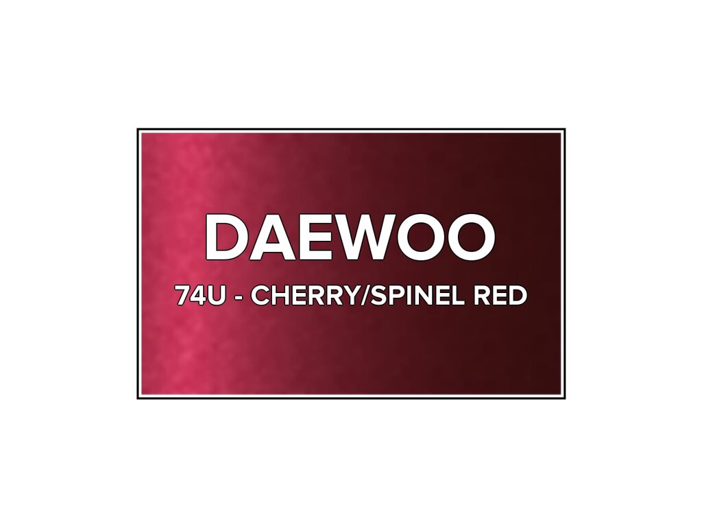 Přečíst článekČervená metalíza Daewoo 74U Cherry/spinel Red do pistole v balení o objemu 100ml. Barva CHERRY/SPINEL RED přesně odpovídá autolaku 74U, používaného na vozech Daewoo v letech 1997-2012. Barva na všechny povrchy, snadná aplikace, 100% krytí.