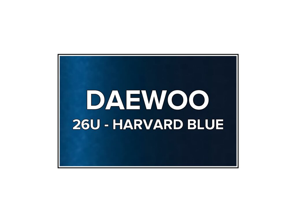 Přečíst článekModrá metalíza Daewoo 26U Harvard Blue ve spreji o objemu 400ml. Barva HARVARD BLUE přesně odpovídá autolaku 26U, používaného na vozech Daewoo v letech 1996-1998. Barva na všechny povrchy, snadná aplikace, 100% krytí.
