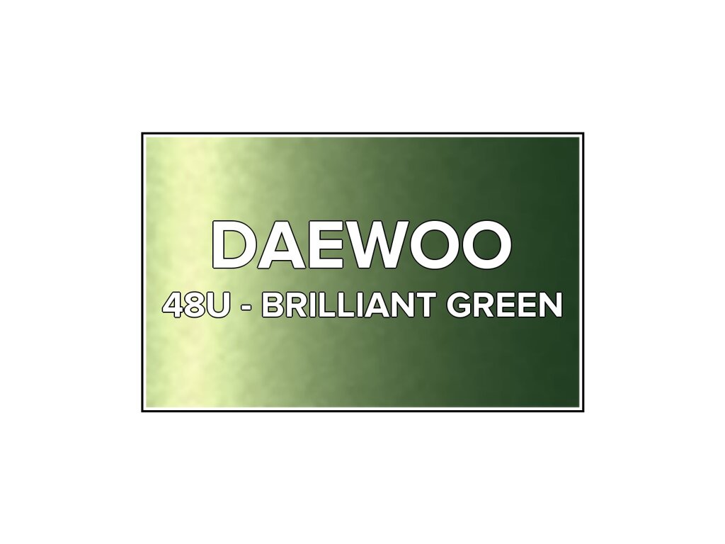 Přečíst článekZelená metalíza Daewoo 48U Brilliant Green ve spreji o objemu 400ml. Barva BRILLIANT GREEN přesně odpovídá autolaku 48U, používaného na vozech Daewoo v letech 2002-2005. Barva na všechny povrchy, snadná aplikace, 100% krytí.