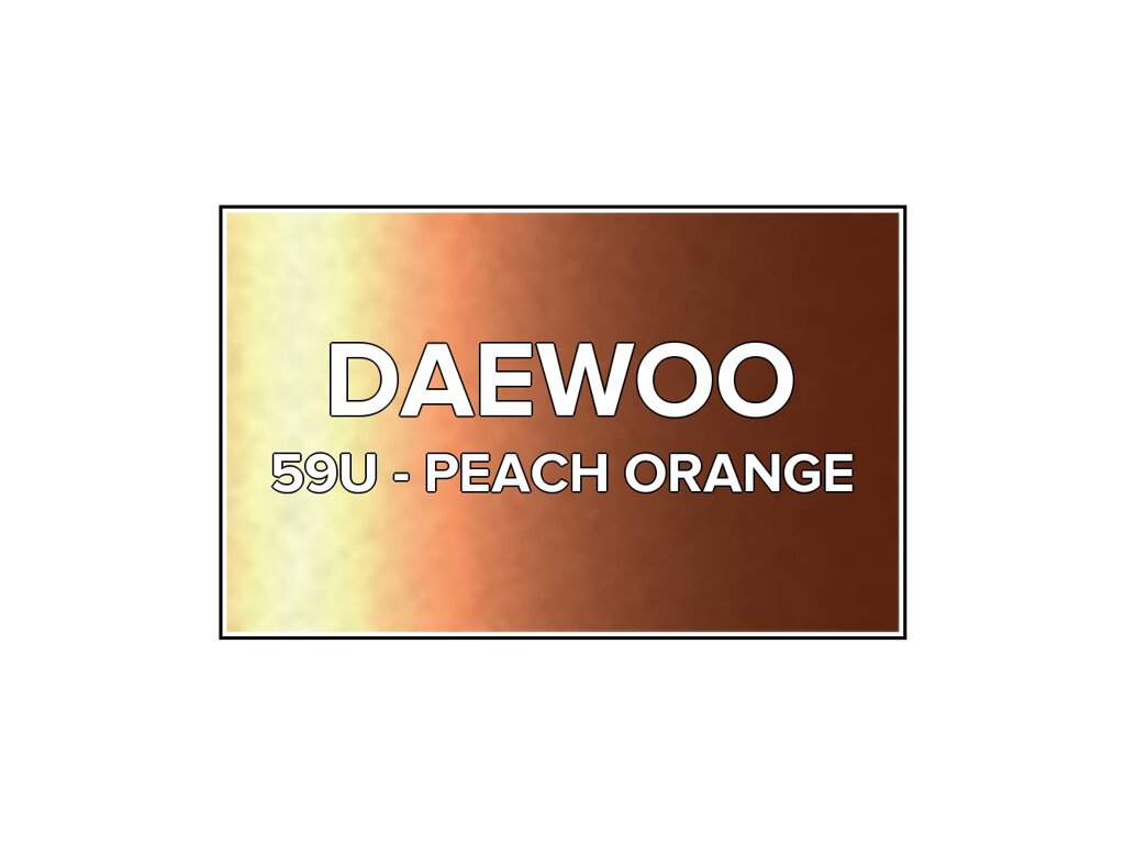 Přečíst článekOranžová metalíza Daewoo 59U Peach Orange ve spreji o objemu 400ml. Barva PEACH ORANGE přesně odpovídá autolaku 59U, používaného na vozech Daewoo v letech 2005-2007. Barva na všechny povrchy, snadná aplikace, 100% krytí.