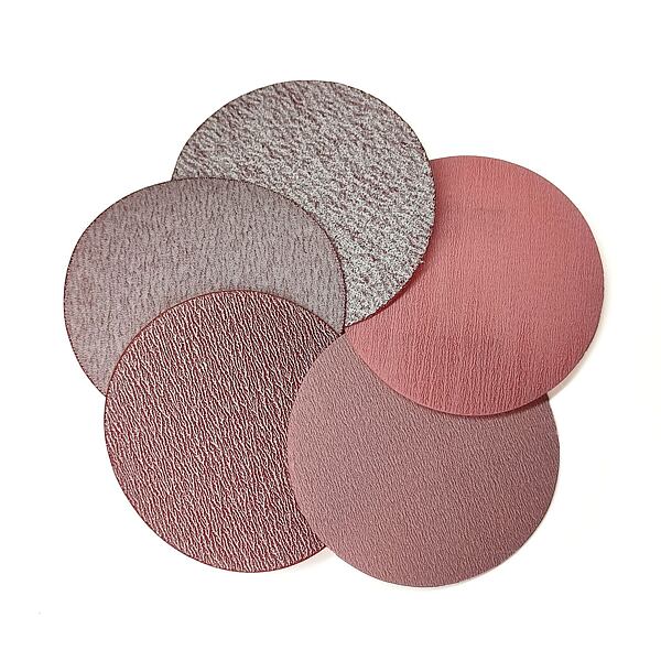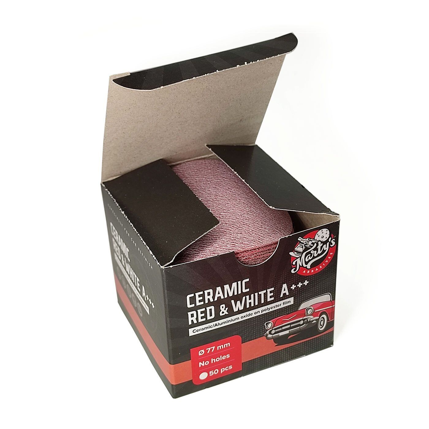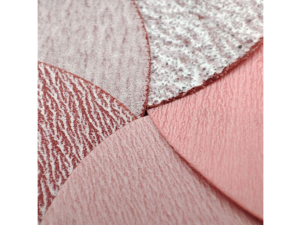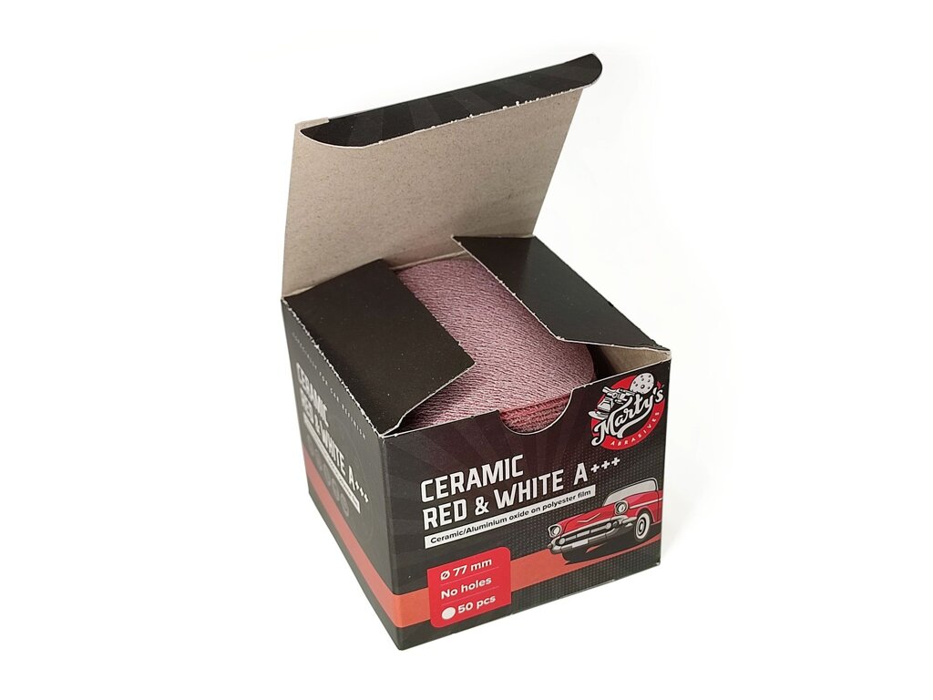 Brusivo Marty's Ceramic Red&White na kotoučích o průměru 75mm a zrnitosti P240 kombinuje keramické zrno se zrny z oxidu hlinitého, společně umístěné na podložce z folie.
