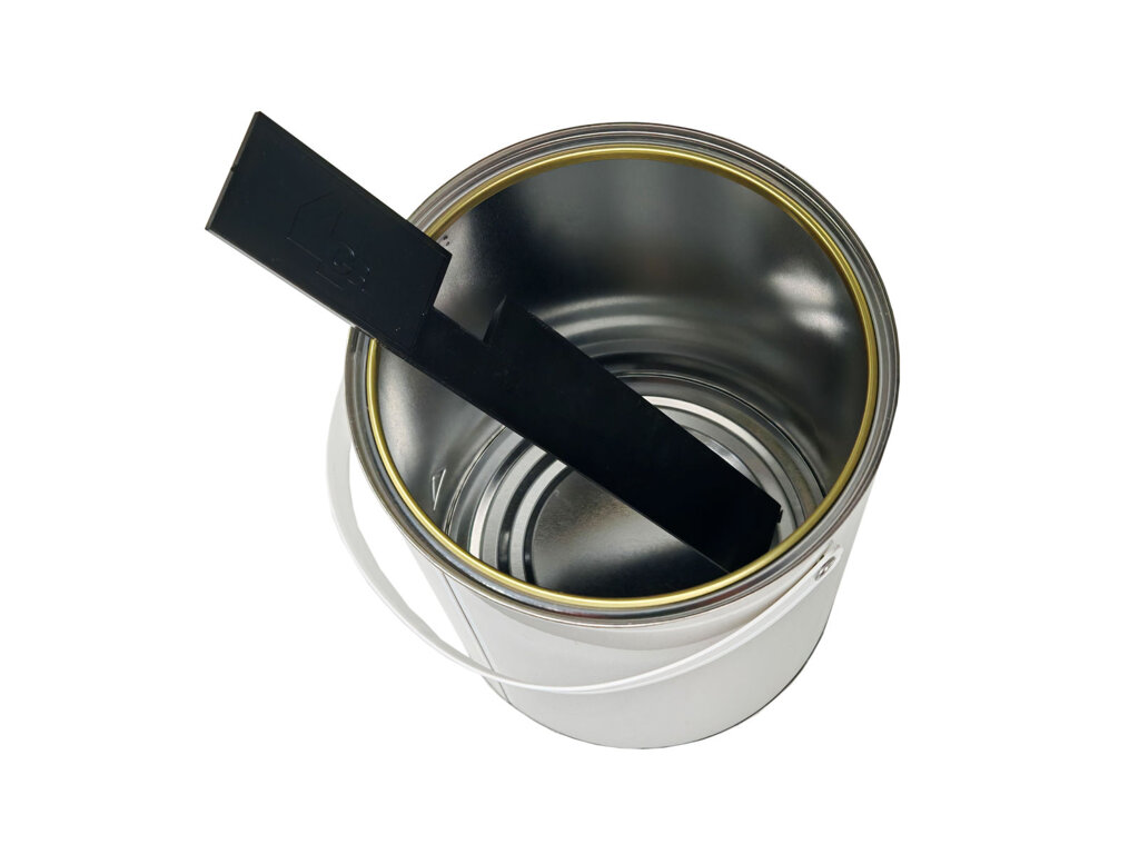 Speciální plastová špachtle, která má zploštělé hrany a speciální výkus zapadající přímo do plechovky, je ideálním pomocník pro důkladné promíchání barvy v plechovce.