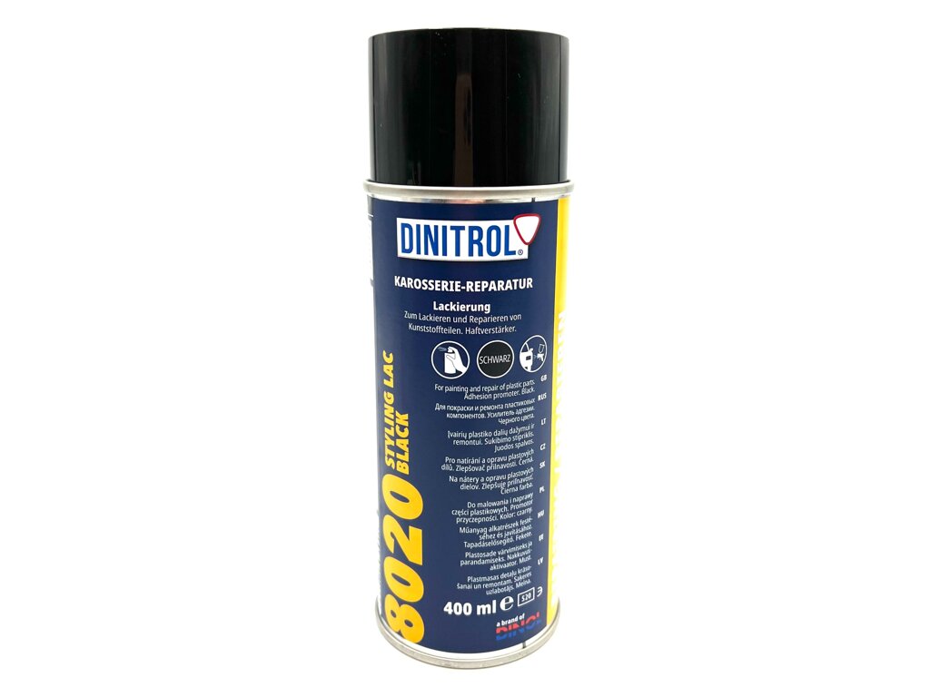 a járművek külsején (lökhárítók, díszlécek stb.) A Dinitrol 8020 egy gyorsan száradó akrilfesték. Kombinált összetétele nem károsítja a műanyagokat. A felhordás után matt, selymes filmréteget képez, amely ellenáll a szórósónak és a mosósoroknak.