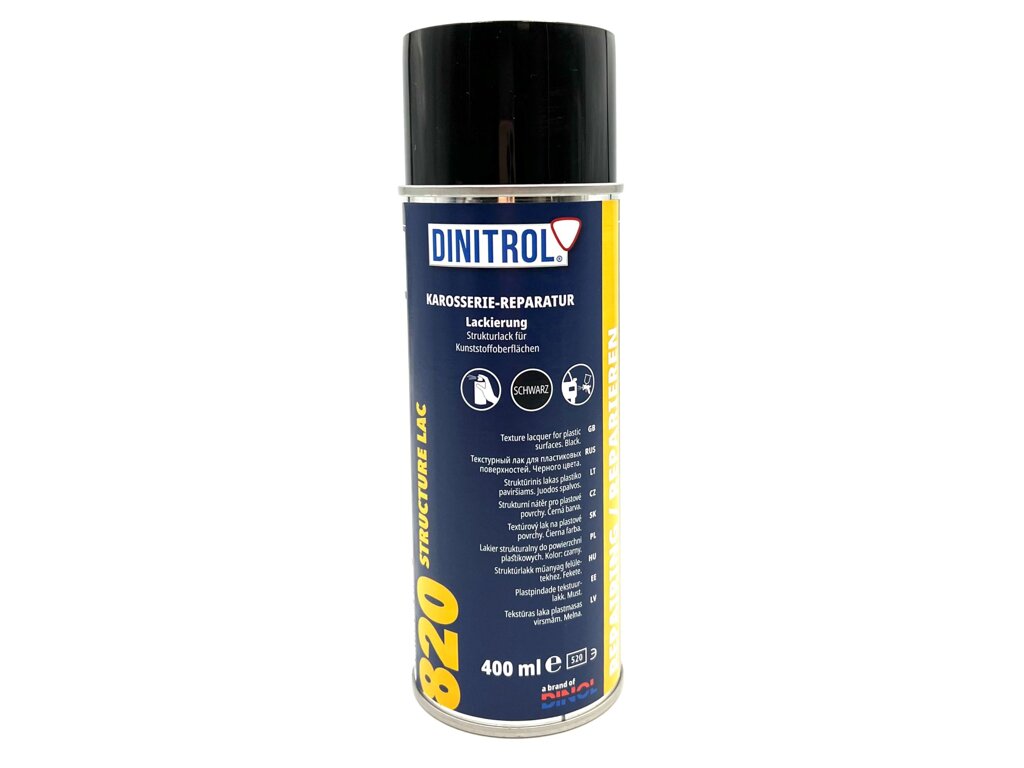 dílů jako jsou nárazníky, spoilery, zástěrky a jiné plastové části automobilů. Díky Dinitrol 820 získáte stejnou strukturu plastu jako u nových dílů. Používá se při opravách nebo obnově dílů. Přilne k téměř všem plastovým hmotám. Strukturovaný povrch se doporučuje následně přelakovat Dinitrol 8020 lakem na plasty.