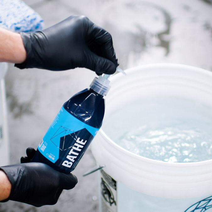 Do 10 litrového kbelíku s vodou (pro maximální účinnost doporučujeme teplou) aplikujte přibližně 20 ml šamponu Gyeon Q²M Bathe a směs důkladně promíchejte, aby vznikla hustá pěna.