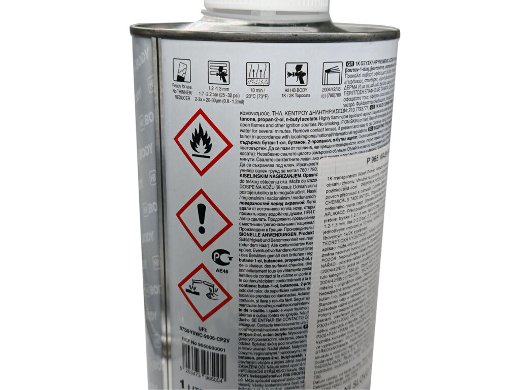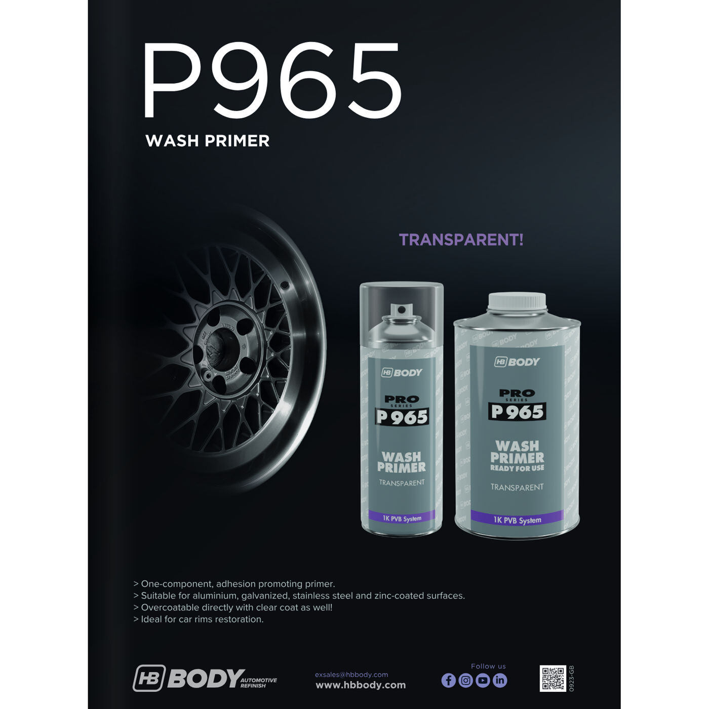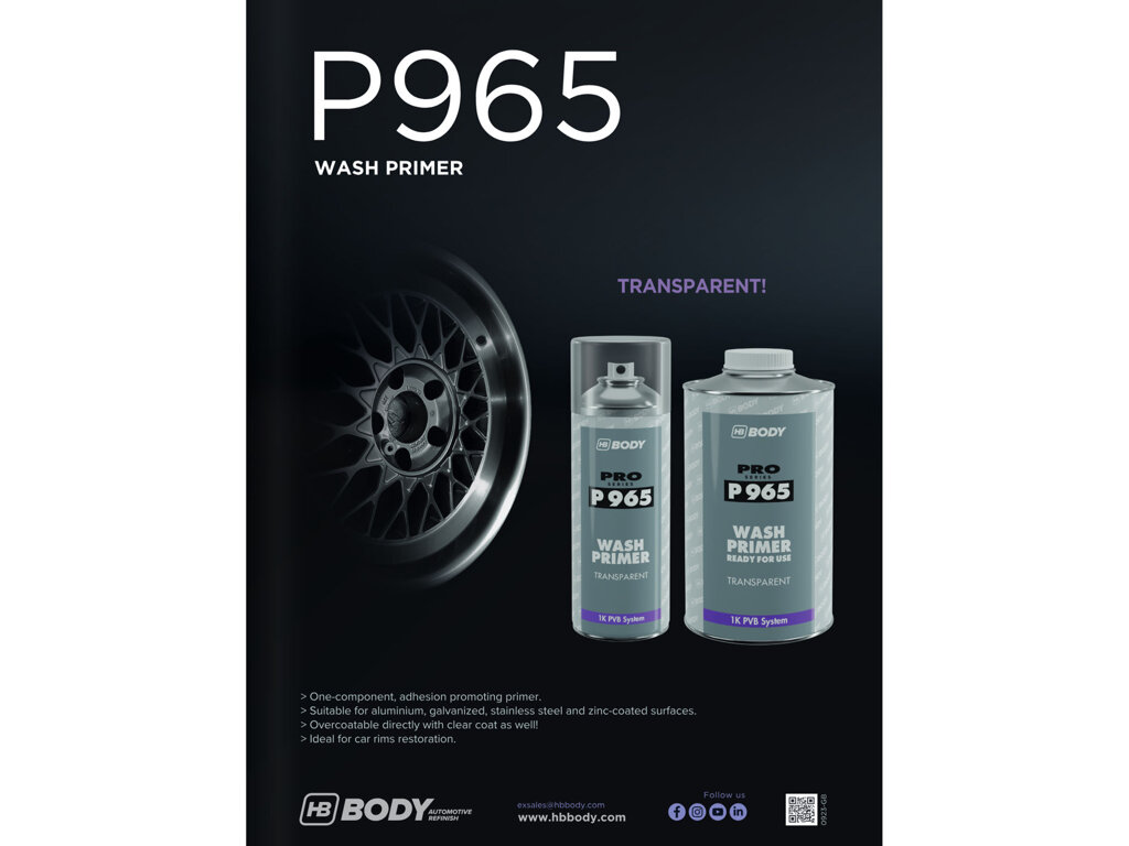 Jednosložkový (nepotřebujete tedy žádný aktivátor/tužidlo!) wash primer P965 se aplikujte ve vrstvě max. 20-30 μm. Doba schnutí 20 min. / 20 o C. Může být přelakován ihned po zaschnutí např. transparentním lakem (disky kol atd.).