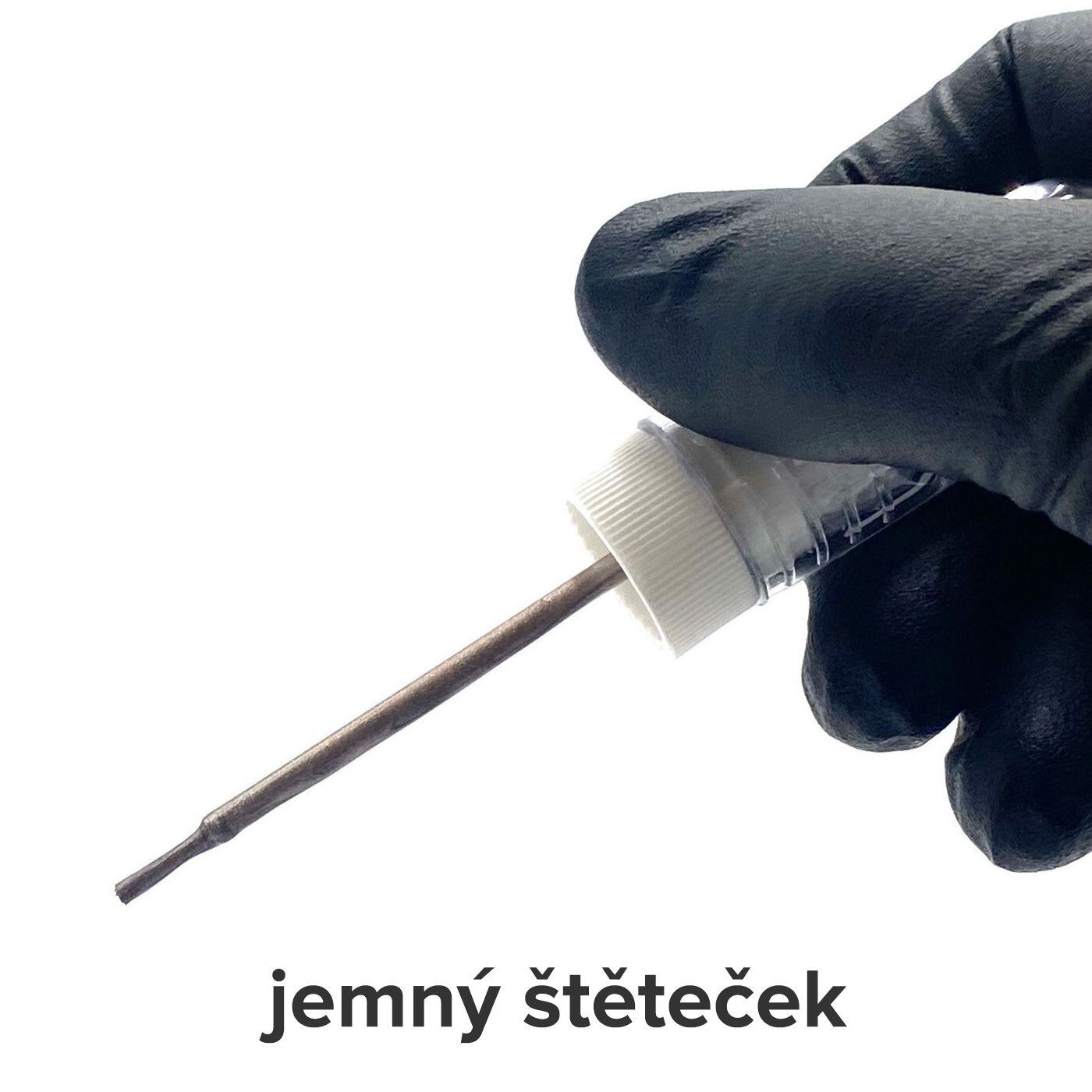 Štěteček, který je umístěn uvnitř lahvičky (jako je tomu zvykem u laků na nehty) vytáhněte po vyšroubování bílého víčka. Nyní můžete pohodlně opravit větší táhlá poškození, jako jsou škrábance v laku nebo jiné defekty, které by se hůře opravovaly retušovacím hrotem.
