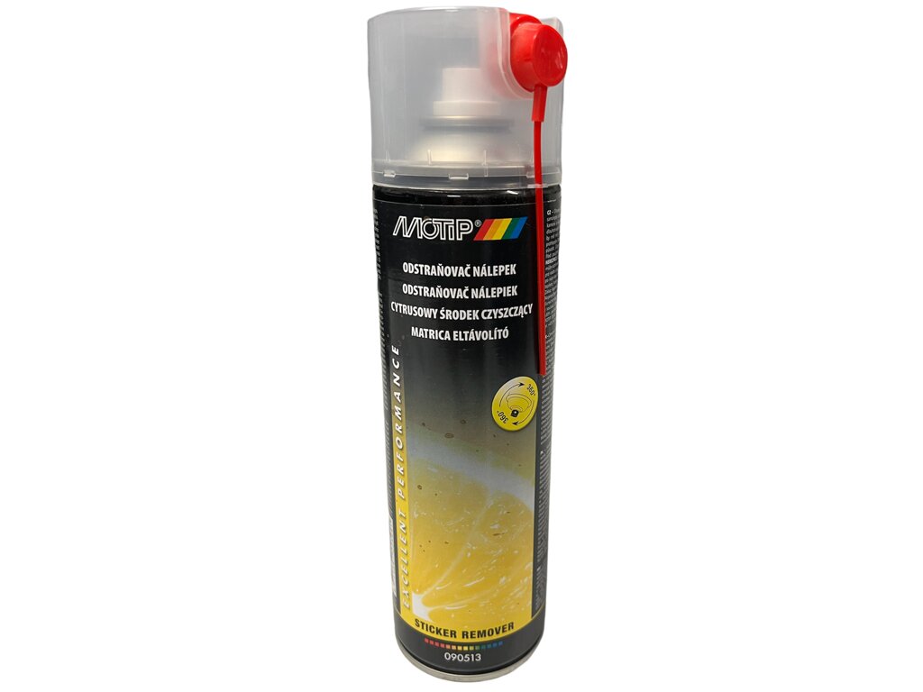 Odstranění pryskyřicových nálepek a zbytků lepidla z nich pomocí spreje Motip je velmi jednoduché. Má silné rozpouštěcí vlastnosti, pomalu se odpařuje, je antikorozní a nezanechává žádné zbytky. Lze jej použít k odstranění nálepek a lepidla z ošetřených i neošetřených částí - kov, dřevo, kámen i různé druhy plastů.
