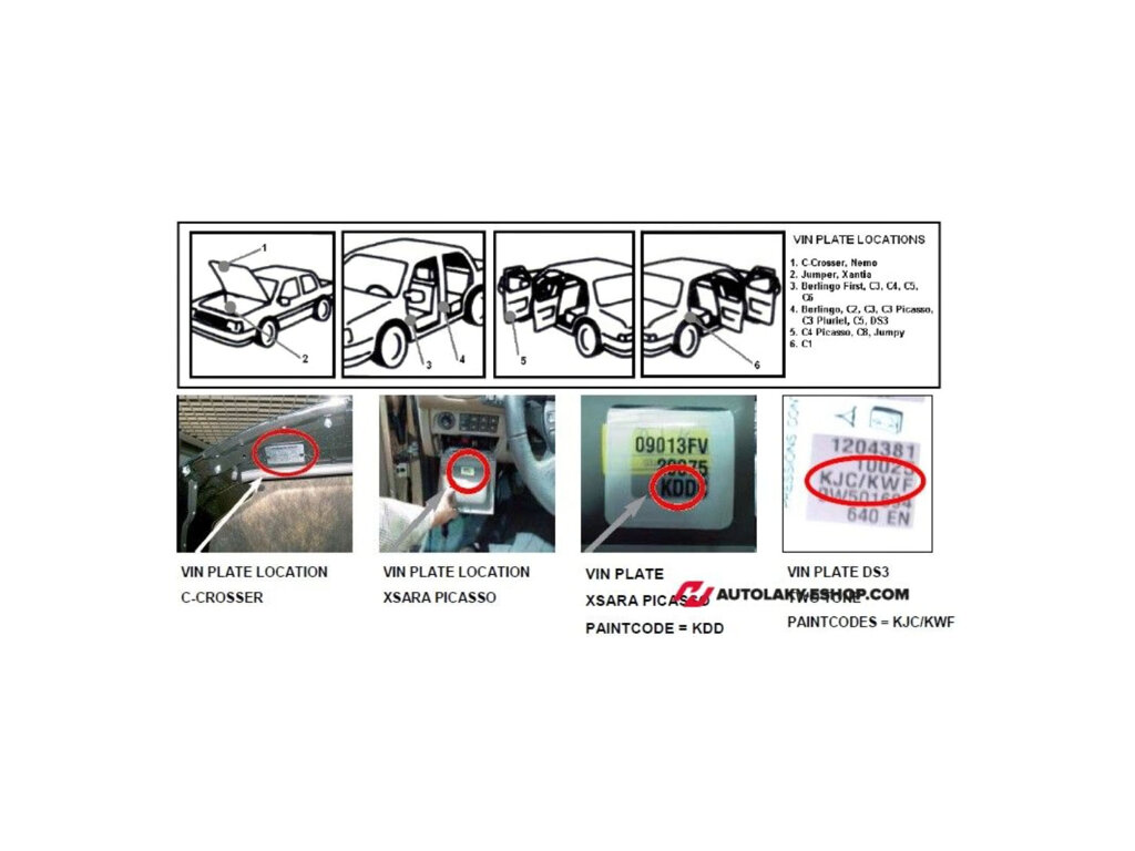 U Citroenu najdete kód barvy na sloupku dveří řidiče nebo spolujezdce, může být také umístěn pod volantem na krytu pojistkové skříně nebo v motorovém prostoru, to nejčastěji u užitkových vozidel.