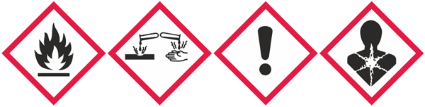 Vysoce hořlavá kapalina a páry. Dráždí kůži. Způsobuje vážné poškození oči. Může způsobit podráždění dýchacích cest. Může způsobit ospalost nebo závratě. Podezření na poškození reprodukční schopnosti nebo plodu v těle matky. Uchovávejte mimo dosah dětí. Chraňte před teplem, horkými povrchy, jiskrami, otevřeným ohněm a jinými zdroji zapálení. Zákaz kouření. Používejte pouze venku nebo v dobře větraných prostorách. Použivejte ochranné rukavice, ochranný oděv, ochranné bryle, obličejový štít