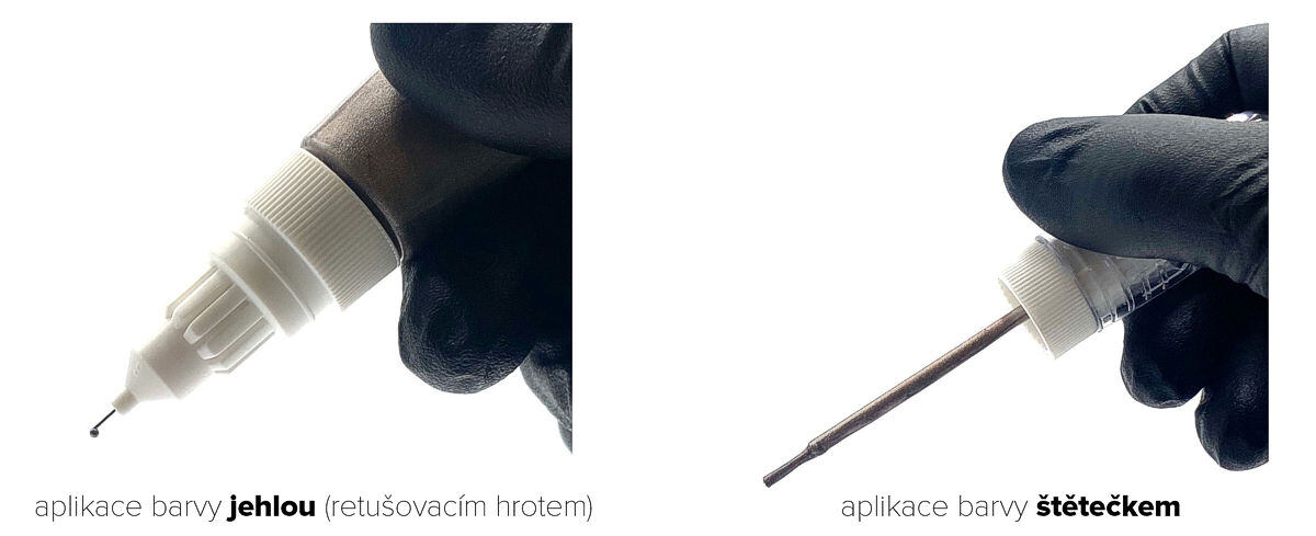 Speciální uzávěr lahvičky vám nabízí dva způsoby aplikace barvy: jehlu (neboli retušovací hrot) a jemný štětec. Nejmenší vady můžete zakápnout pomocí jehly kapkou barvy, větší škrábance můžete přetřít štětečkem. Jehla i štětec jsou integrované přímo do víčka lahvičky.