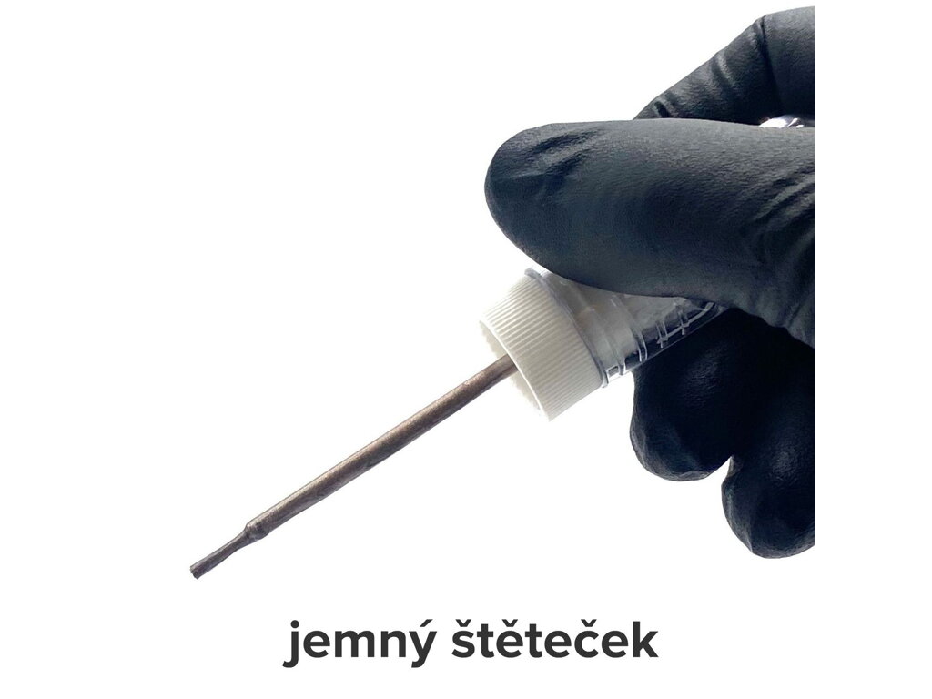 Speciální uzávěr lahvičky vám nabízí dva způsoby aplikace barvy: jehlu (neboli retušovací hrot) a jemný štětec. Nejmenší vady můžete zakápnout pomocí jehly kapkou barvy, větší škrábance můžete přetřít štětečkem. Jehla i štětec jsou integrované přímo do víčka lahvičky.