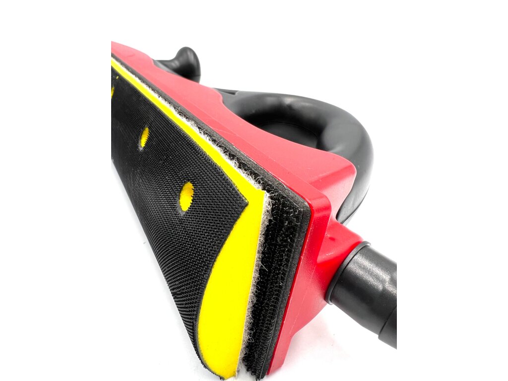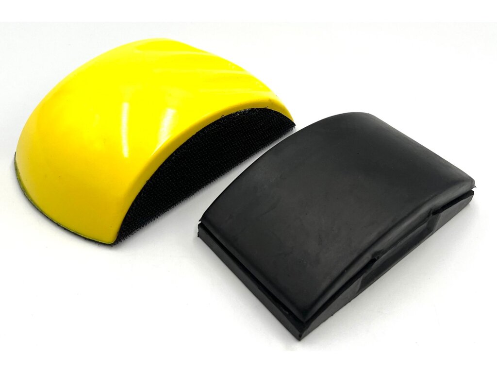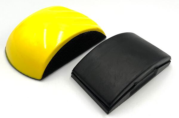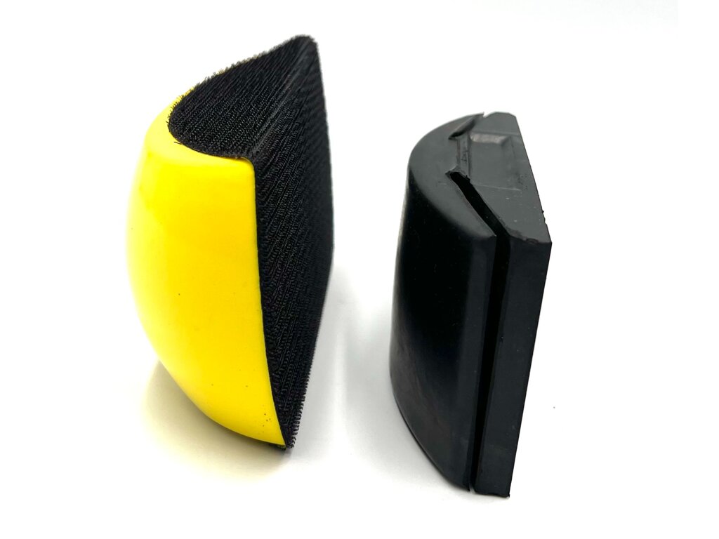 Brusný blok pro kotouče 150mm se suchým zipem 150mm x 80/90 (žlutý) a brusný blok s trny pro uchycení brusných papírů bez suchého zipu 120x68mm (černý).