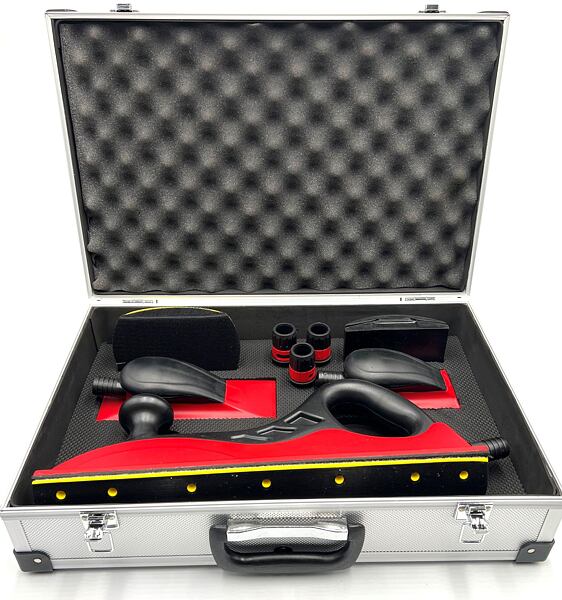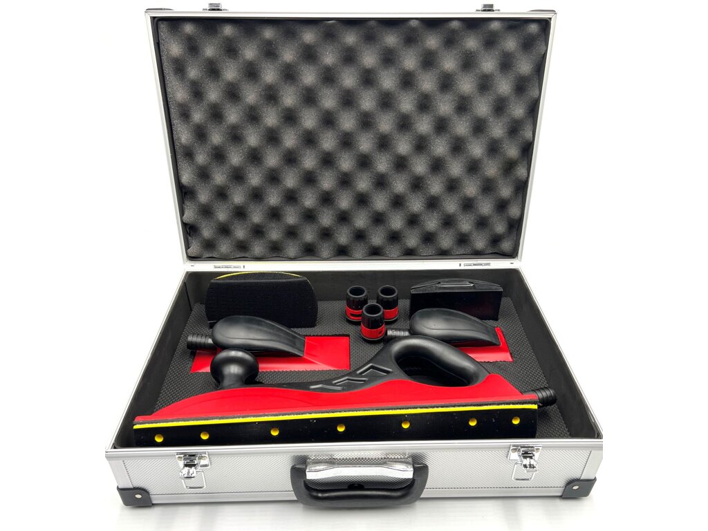 Obsah balení Velký hoblík 70 x 400 mm + zaoblený adaptér, Malý hoblík 70 x 125 mm, Střední hoblík 70 x 200 mm, Brusný blok s trny, Brusný blok se suchým zipem, 3ks redukce na hadici, Odolný kufr