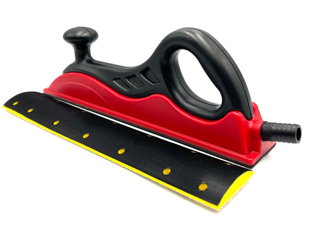 Velkým hoblíkem 70x400mm, na který lze nasadit (pomocí suchého zipu) zaoblený adaptér 70x400mm. Ten je vhodný především na profilované díly a zaoblené povrchy.
