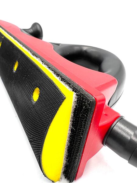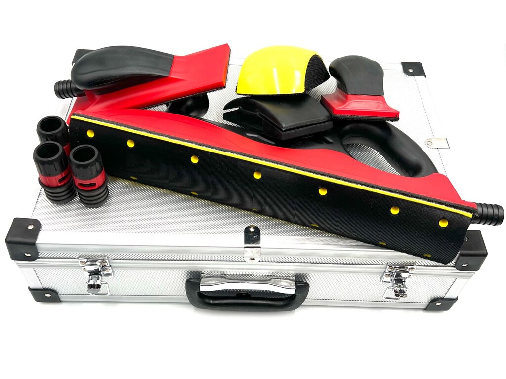 obsahuje lehké plastové náčiní pro broušení. Všechny hoblíky jsou opatřeny suchým zipem a výstupem pro hadici na odsávání. Navíc v kufru naleznete dva ruční brusné bloky.