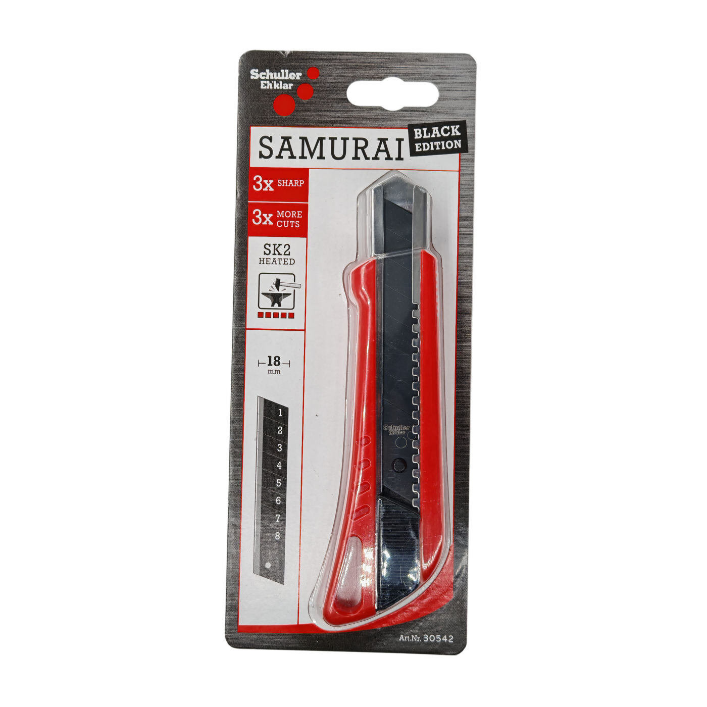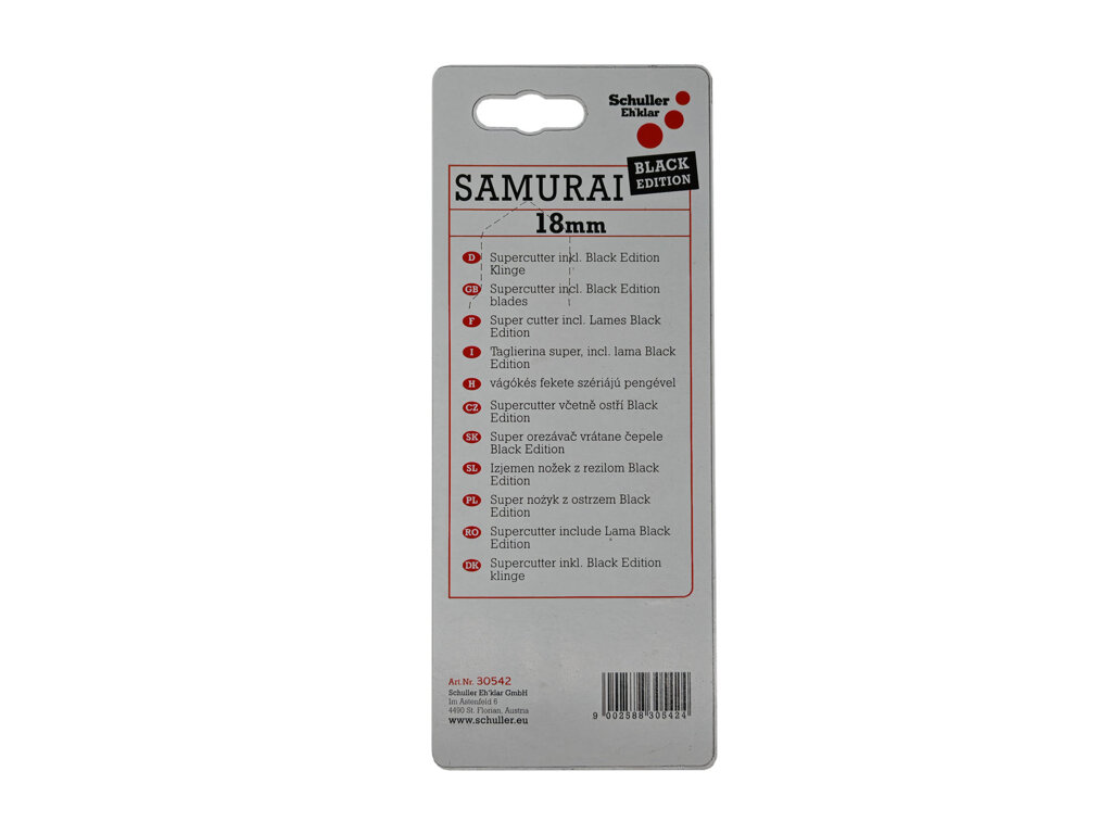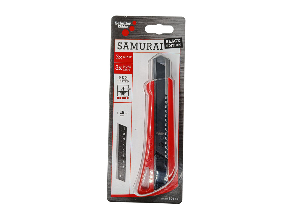 Značkový vysunovací nůž Schuller Samurai s ulamovacím ostřím 18 mm je vhodný pro přesné řezání kartonů, fólií, lepenky, atd.