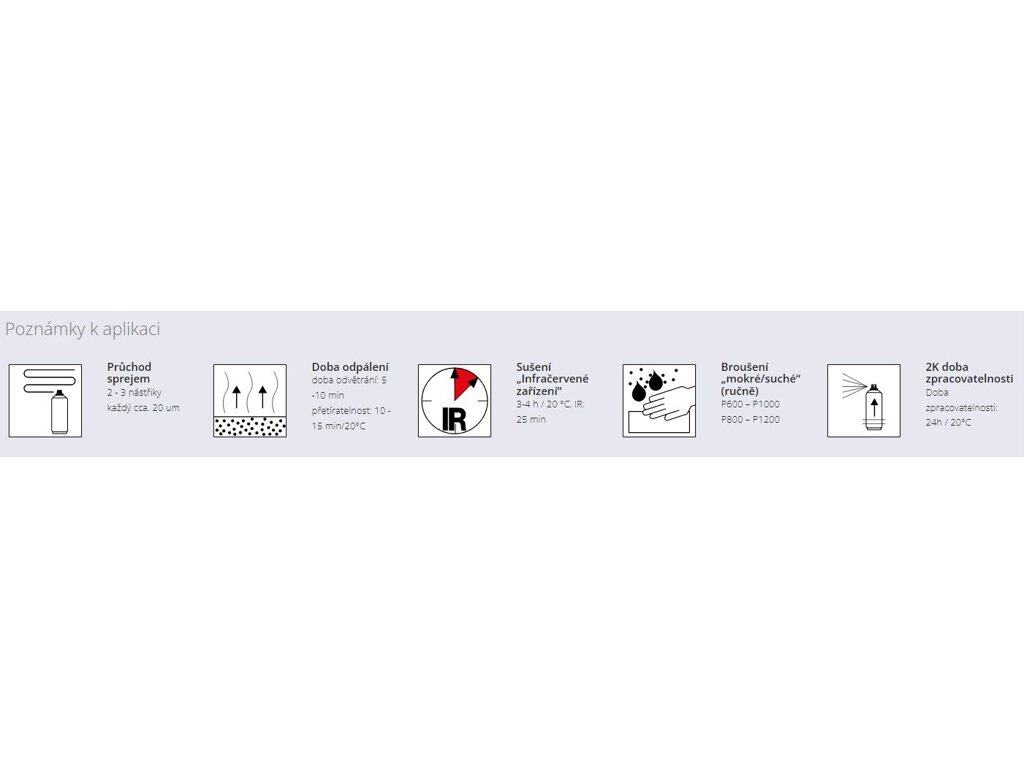 Jednoduché a snadné broušení plniče za mokra (P600-P1000) i sucha (P800-P1200). Má maximální mechanickou odolnost a lze ho přelakovat všemi běžnými systémy jednosložkových základních laků a dvousložkových krycích laků.